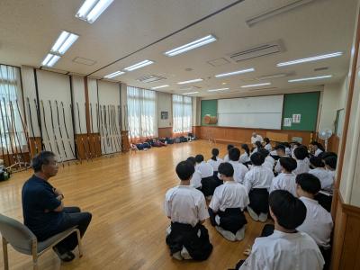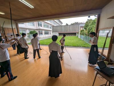 【弓道部】夏季合宿。東洋牛久弓道部の皆さんと合同の練習会を行いました。画像は、弓道講習会の様子です。