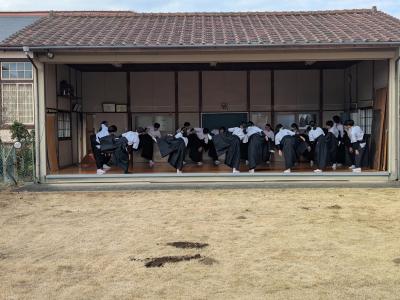 1年間お世話になった弓道場への感謝の気持ちを込めて大掃除を行い、その後は体幹トレーニングを兼ねて「四股」を取り入れたウォーミングアップを実施しました。